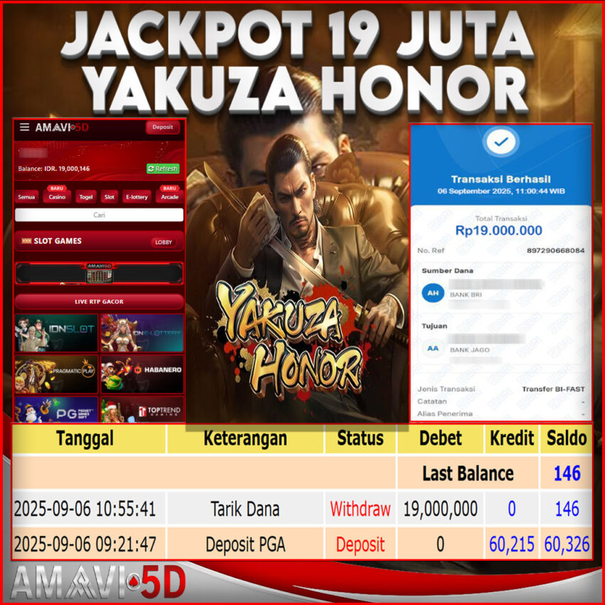 AMAVI5D JACKPOT SLOT YAKUZA HONOR Rp.19.000.000,- LUNAS SABTU, 06 SEPTEMBER 2025